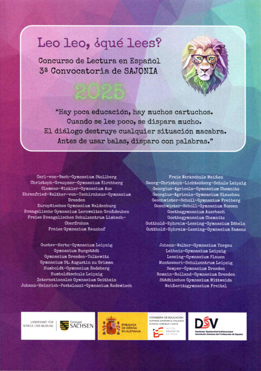 Engagiert und sorgfältig bereiteten Linda und Milly drei Texte vor, von denen per Los einer vorgetragen wurde. Mit Begeisterung, Ausdruckskraft und sicherem Sprachgefühl präsentierten sie ihre Texte vor der Jury. Die Teilnahme war nicht nur eine tolle Gelegenheit, ihre Spanischkenntnisse unter Beweis zu stellen, sondern auch die Freude am Lesen und an der spanischen Sprache mit 48 anderen Schülerinnen und Schülern aus ganz Sachsen zu teilen. Da nur die besten Vorleser eingeladen wurden, war die Konkurrenz entsprechend hoch und ein Platz auf dem Treppchen war unseren Schülerinnen leider nicht vergönnt.