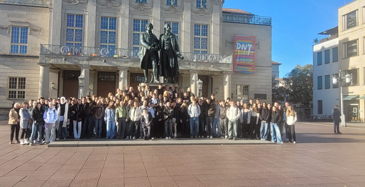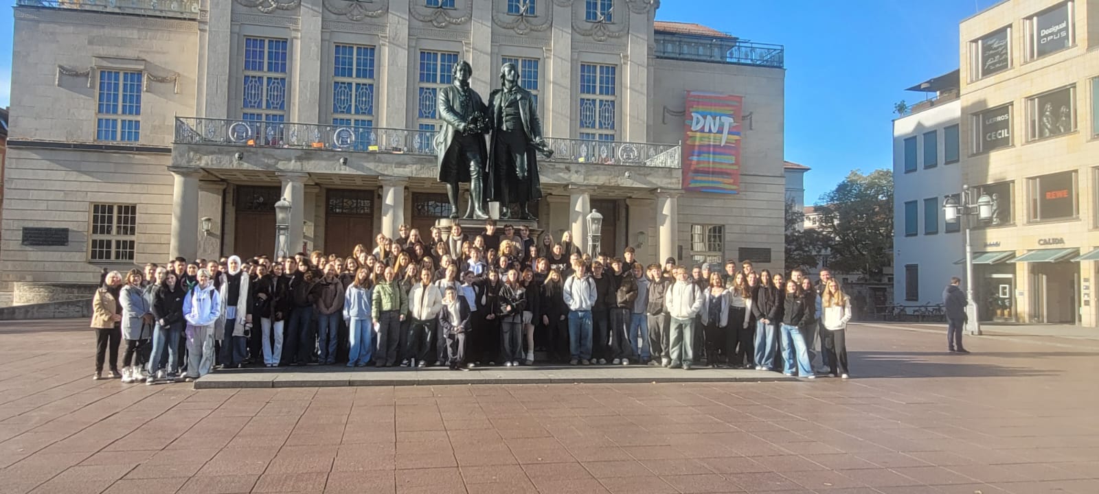 Heute, am 05.11.2025, waren die 10. Klassen auf Exkursion in die Altstadt Weimar in Thüringen. Dort hatten sie die Wahl zwischen dem Besuch des Goethehauses und des Schillerhauses mit der dazugehörigen Faustausstellung. Zusätzlich war die Aufgabe gestellt, selbstständig mit dazugehörigen Schwerpunkten eine Stadtrallye durchzuführen. Hierzu suchten sie verschiedene Sehenswürdigkeiten auf, um sich anschließend davor zu fotografieren und Wissenswertes zu den Wahrzeichen zu bearbeiten.