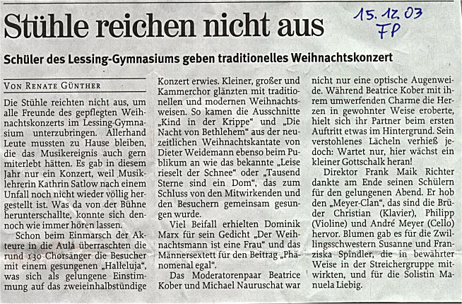 | 18.12.03 | "Der Weihnachtsmann ist eine Frau..." Impressionen zum Weihnachtskonzert - Vogtlandanzeiger >>, Freie Presse >> |