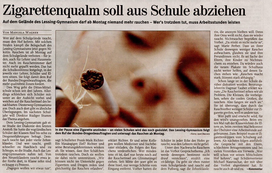 Projekt rauchfreie Schule - wir machen uns auf den Weg! Ab heute Rauchverbot auf dem gesamten Schulgelände, ein erster wichtiger Meilenstein auf einem langen, mühevollen Weg... Freie Presse >> / Vogtlandanzeiger >> |