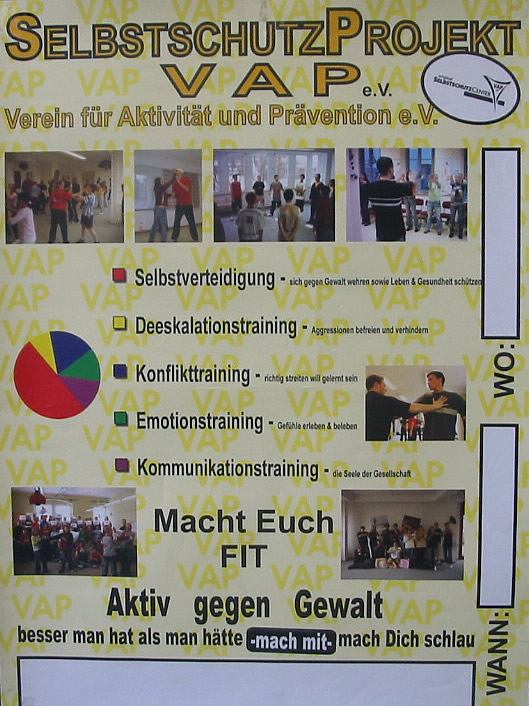 Das Training erfolgt interaktiv, praxisnahe und durchaus handfest. Interessant sind auch die psychologischen Hintergründe auf Seiten des Aggressors, des potenziellen Opfers sowie die sich daraus ergebenden Strategien zur Abwehr bzw. Deeskalation von Gewalt.