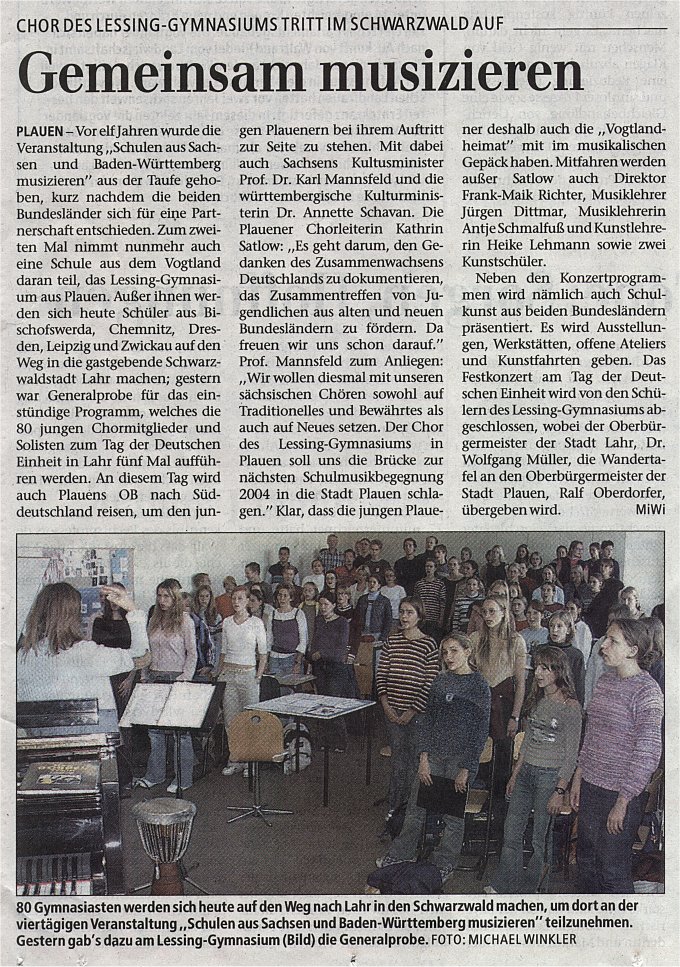 | 01.10.03 | Chor des Lessing-Gymnasiums tritt im Schwarzwald auf Der Vogtlandanzeiger berichtet: 80 Gymnasiasten und fünf Lehrer machten sich heute auf den Weg nach Lahr im Schwarzwald, um dort an der viertägigen Veranstaltung "Schulen aus Sachsen und Baden-Württemberg musizieren" teilzunehmen... |