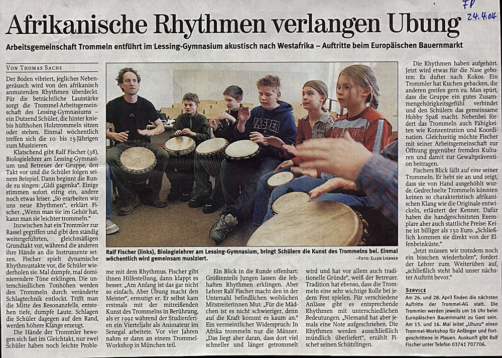 | 24.04.04 | Afrikanische Rhythmen verlangen Übung Arbeitsgemeinschaft Trommeln entführt im Lessing-Gymnasium akustisch nach Wesrafrika... Freie Presse >> |
