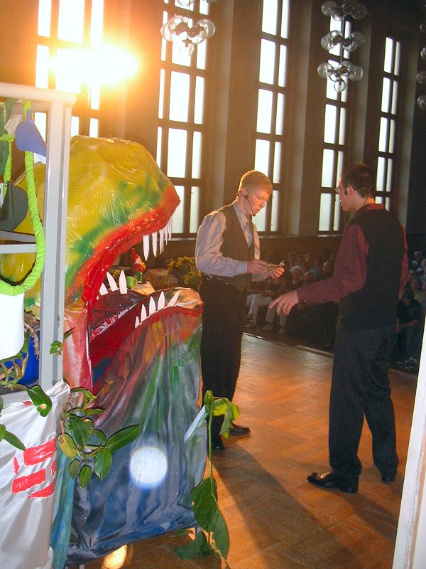 Dieses Wagnis gelang! Von der aufwändigen Requisite, die von einer "funktionierenden" übermannsgroßen fleischfressenden Pflanze gekrönt wurde (Bü sei Dank!) bis hin zur überzeugenden Besetzung der Charaktere bot sich dem Publikum am Freitag bzw. am Sonntag in der gut gefüllten Aula etwas ganz Besonderes.