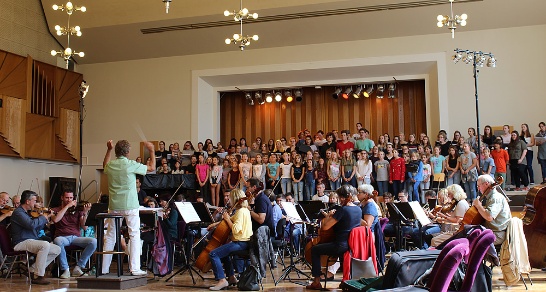 Wo sonst Musiklehrer oder hippe Schüler den Taktstock schwingen, dirigierte am Dienstag, dem 22.08.2017 Generalmusikdirektor Stefan Fraaß sowohl sein Orchester als auch den Lessing-Schulchor. In dieser Konstellation wäre in der 400-plätzigen Aula kaum noch Raum für Besucher, da deren Bühne vom Chor, der Zuschauerraum aber fast komplett vom Orchester ausgefüllt wurde.