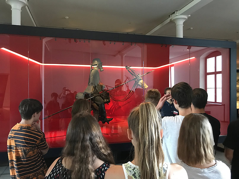 Unzählige Exponate und die dahinterstehenden Geschichten der Museumsführer gaben uns ein lebendiges Bild über die deutsche Militärgeschichte. Besonders beeindruckend waren die interaktiven Bereiche des Museums. An einer Stelle konnten wir den Geruch der Schützengräben des Ersten Weltkriegs wahrnehmen. So erfuhren wir etwas über das Leben der Soldaten, die jeden Tag an der Front mit dem Tod konfrontiert waren. In einem anderen Bereich wurden mit Hilfe eines Greenscreens unser Schatten eingefroren – mehr als solche Schatten blieb von den Betroffenen der Atombombenabwürfe von Hiroshima und Nagasaki nicht übrig. Insgesamt waren das schreckliche Eindrücke.
