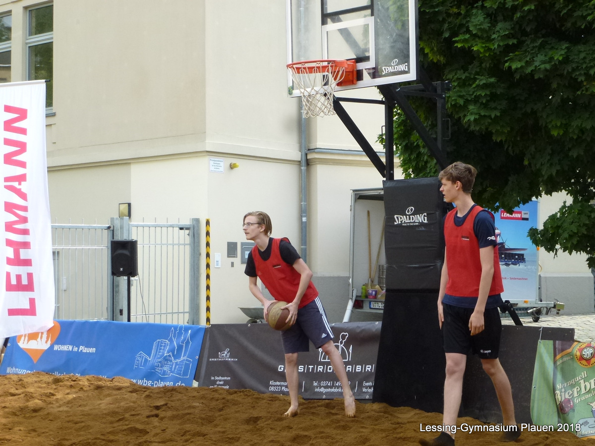 Beach- Basketball- das Spektakel auf Sand lockte bereits zum 6. Mal interessierte Schulsportteams in das Zentrum unserer Stadt. Wie auch in den vergangenen Jahren konnte unsere Schule die zahlenmäßig meisten Spieler aufweisen. Gut vorbereitet und organisiert von ehemaligen Schülern unserer Schule( Franziska Grahl und Alexander Fickel) fand das Turnier um die Medaillen bei den Vogtlandspielen wieder bei bestem Wetter, cooler Musik und guter Laune statt. Unsere gemeldeten 5 Teams merkten sehr schnell, wie kraftraubend diese Spiele sind, schnelles Umdenken, präzise Korbwürfe und clevere Zuspiele sicherten den Erfolg. Der Kampf um jeden Ball( auch mal im Sand)dominierte die vielen Spiele. Angetreten waren unsere Lessing- Schüler bei den Jungen und mit einem Mädchenteam im Mixed- Turnier.