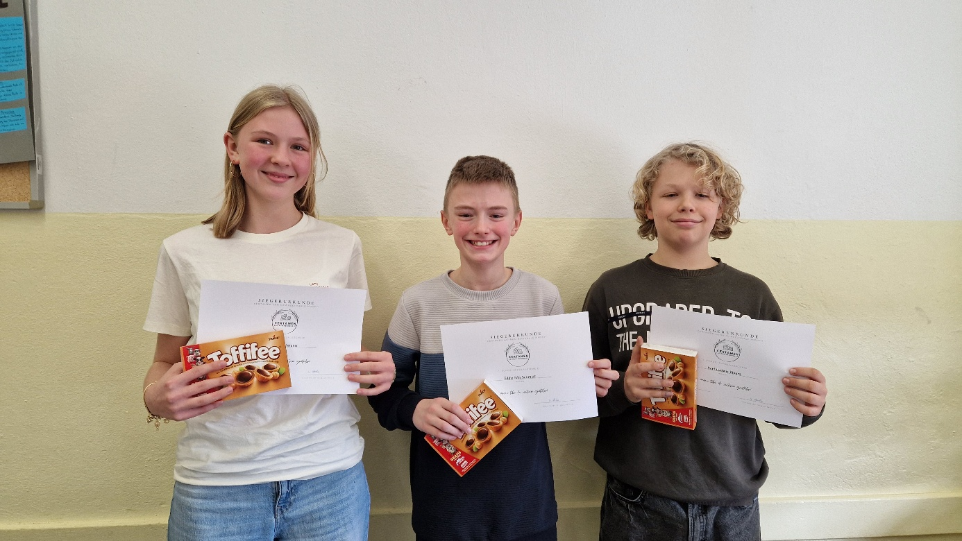 Paula Pöhlmann, Eddie Schmidt und Karl Luwig Elbers qualifizierten sich als die besten Drei für die zweite Stufe, die am 16.03. in Zwickau stattfindet. Dort messen sie sich mit den besten aller Gymnasien des Regionalbereiches Zwickau, zu dem auch das Vogtland zählt.