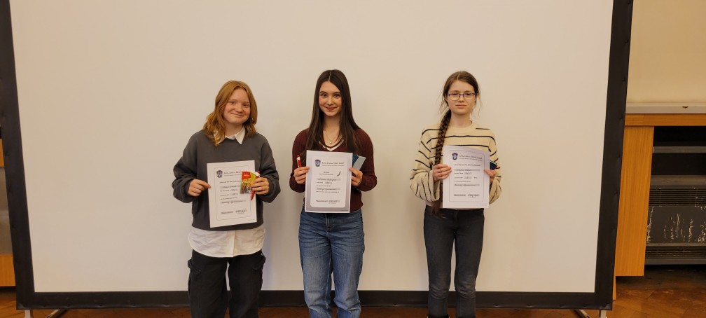 Beim schulinternen Lesewettbewerb „Leo Leo“ der Klassenstufe 8 (zweite Fremdsprache) konnte sich Ariana Fadeyeva (8e) vor Sophia Berger (8c) und Anais Ernst (8c) durchsetzen und wird uns somit beim Landesfinale in Leipzig am 22.06.2026 vertreten.