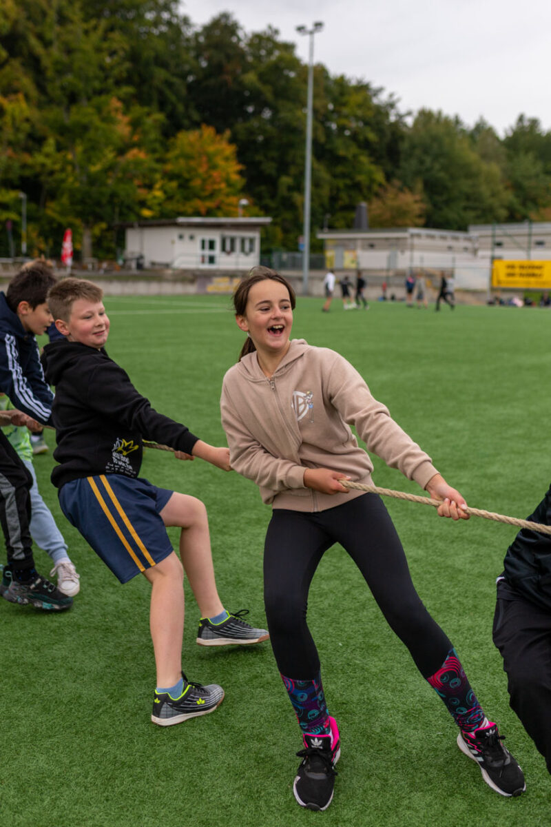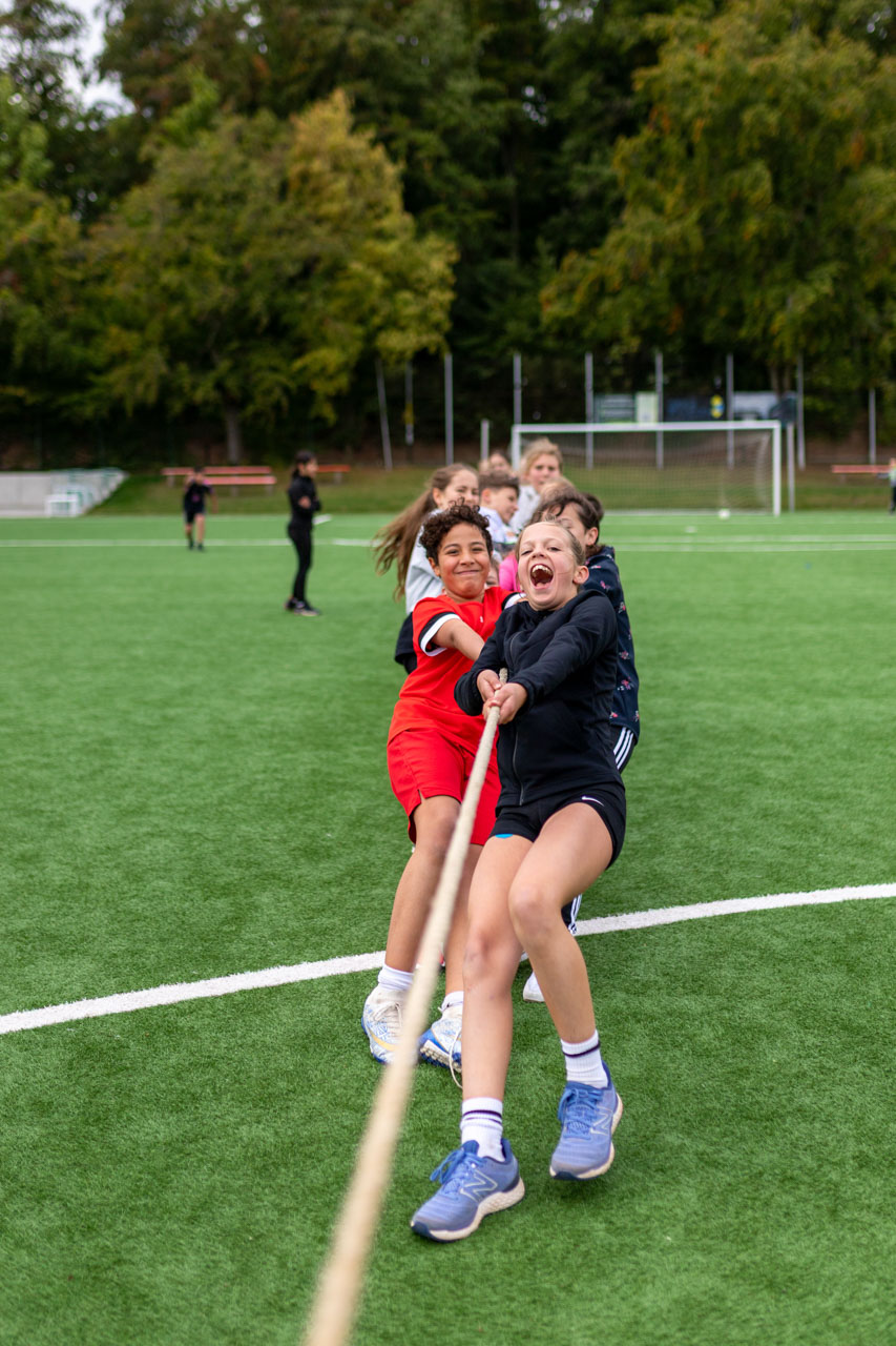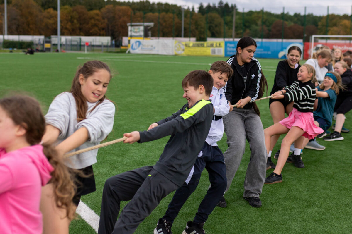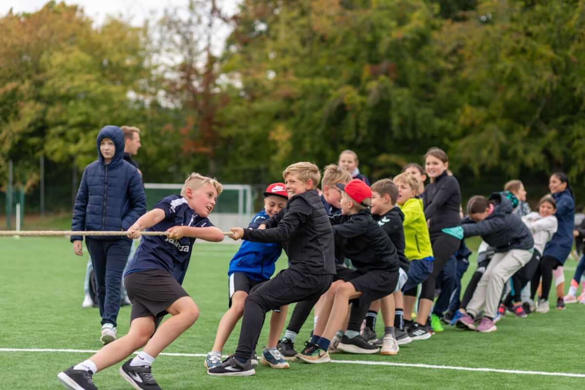 5 bis 7 ihre Kräfte und Teamfähigkeit im Zweifelderball und beim Tauziehen unter Beweis stellten.