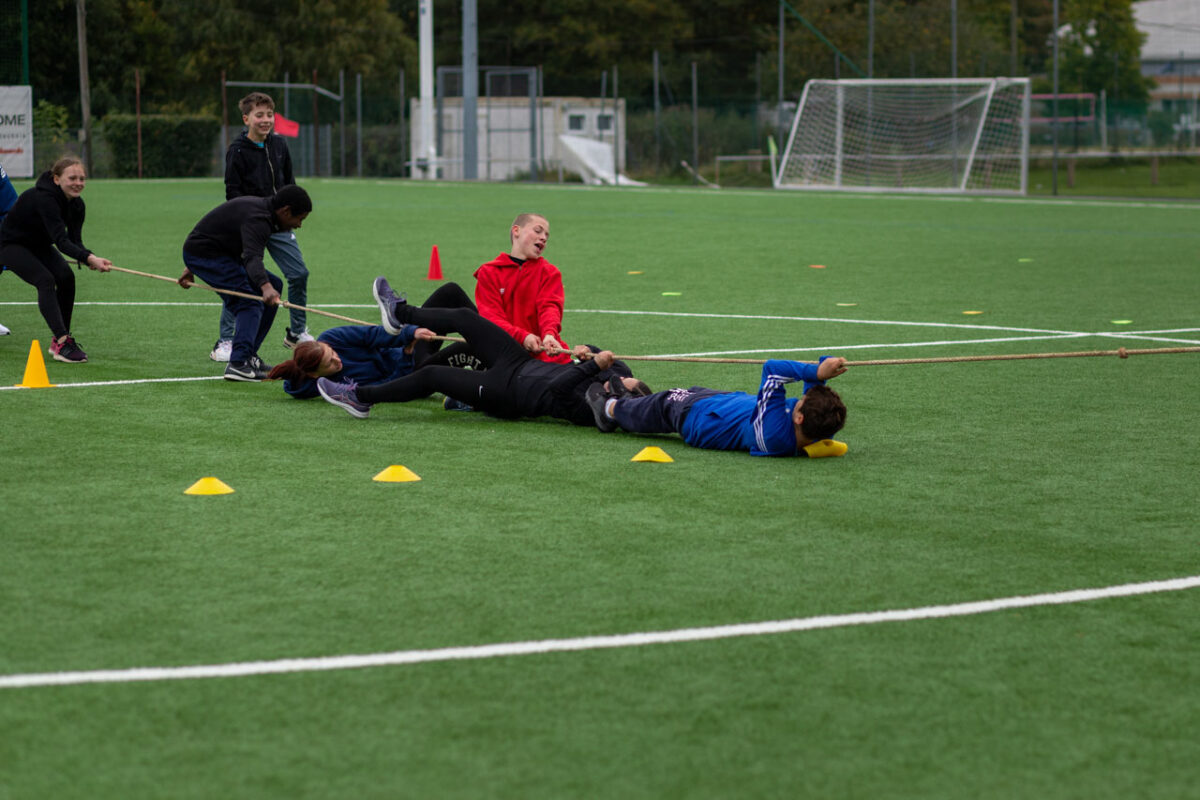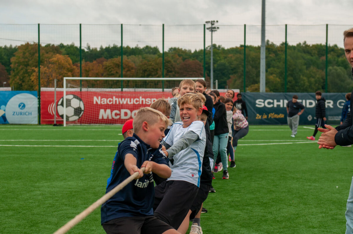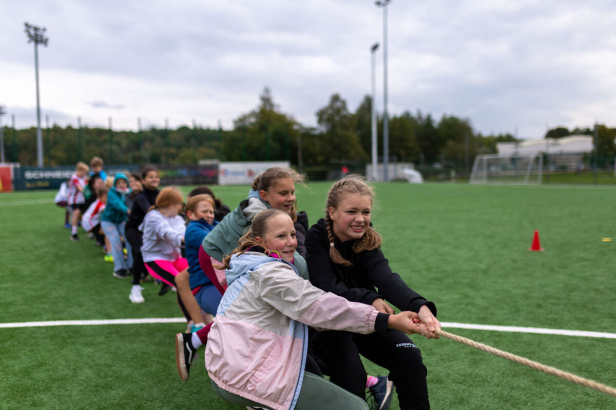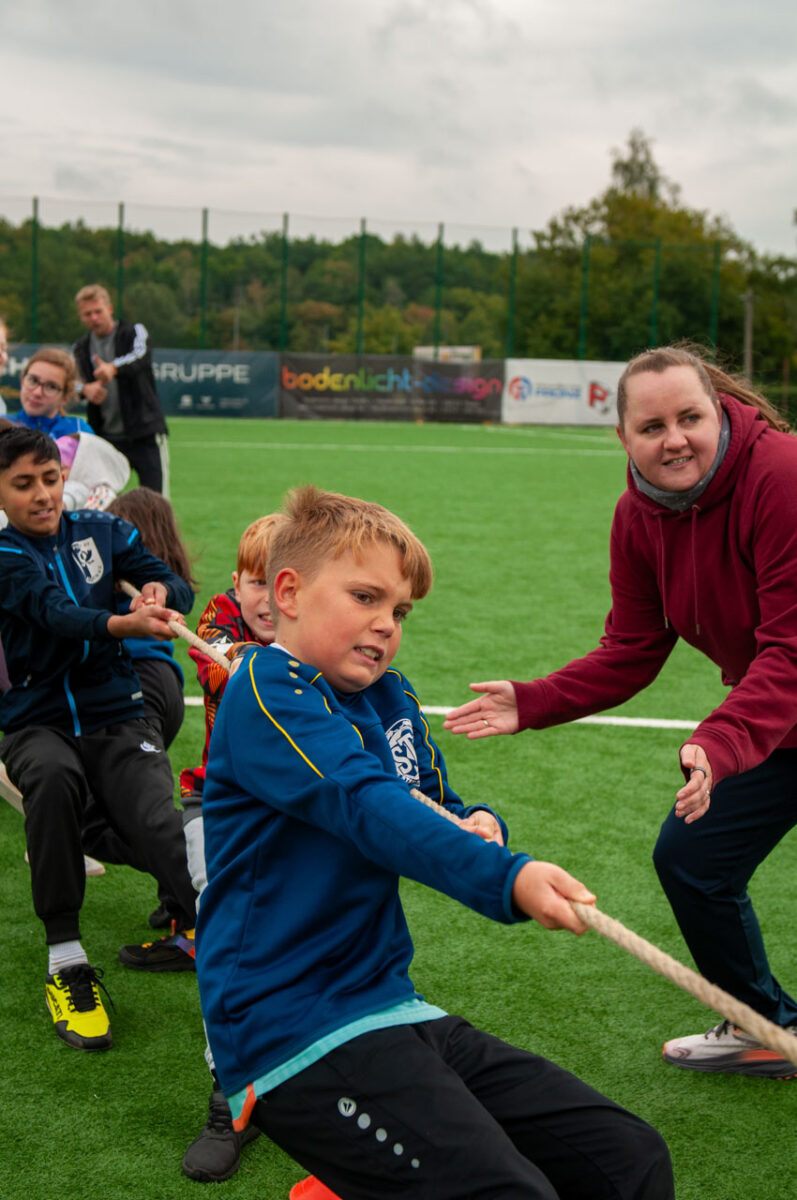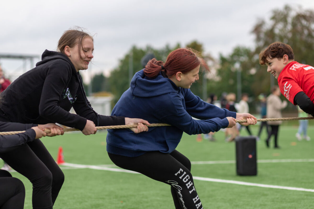 5 bis 7 ihre Kräfte und Teamfähigkeit im Zweifelderball und beim Tauziehen unter Beweis stellten.