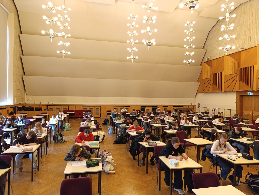 Versammelten sich in der in der 5./6. Stunde bereits 57 „kleine Kängurus“ der 5.und 6. Klassen in der Aula, waren es nach der Mittagspause nochmal 42 „größere Kängurus“ der 7. bis 12. Klassen. Ehrgeizig kämpften sie jeweils bis zu 75 Minuten um richtige Antwortbuchstaben. Es mussten teilweise recht anspruchsvolle Knobelaufgaben gelöst werden.